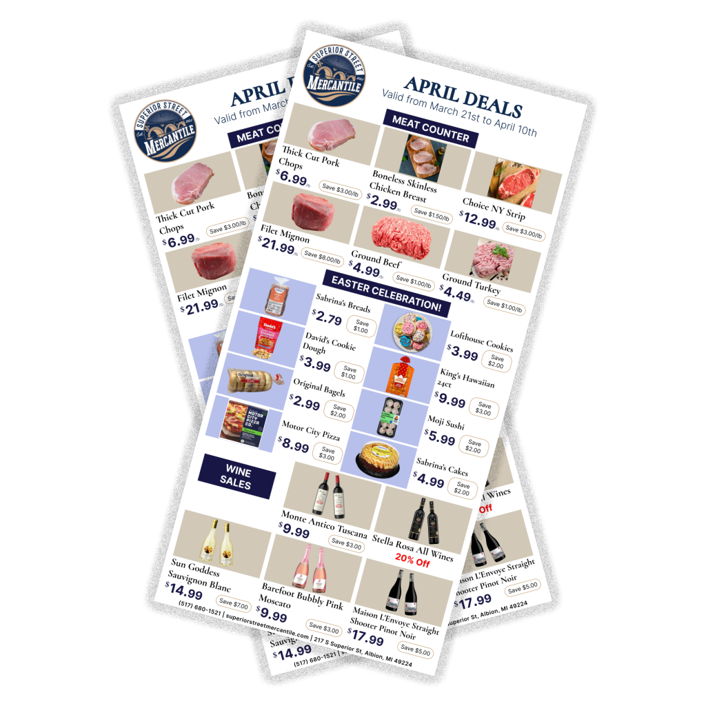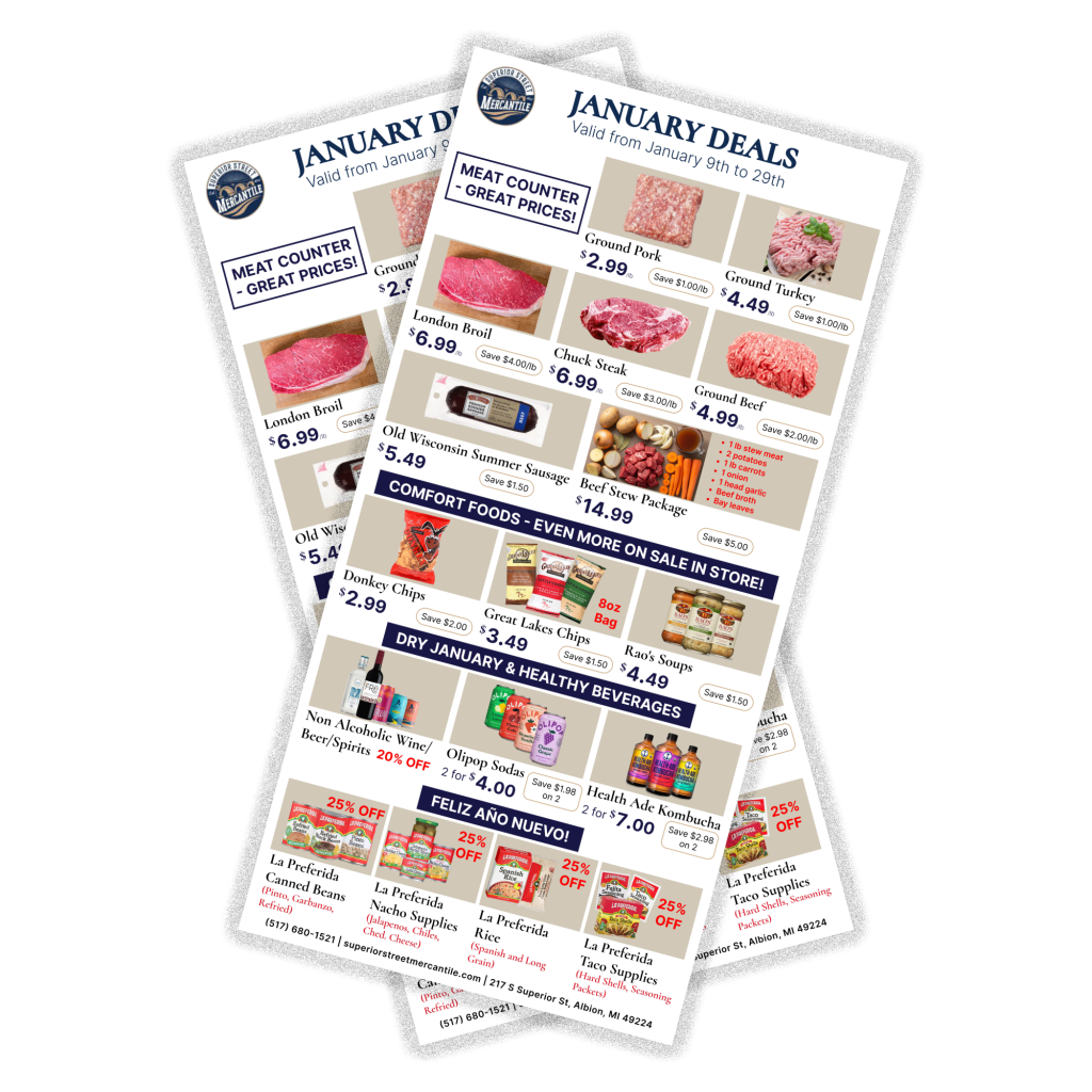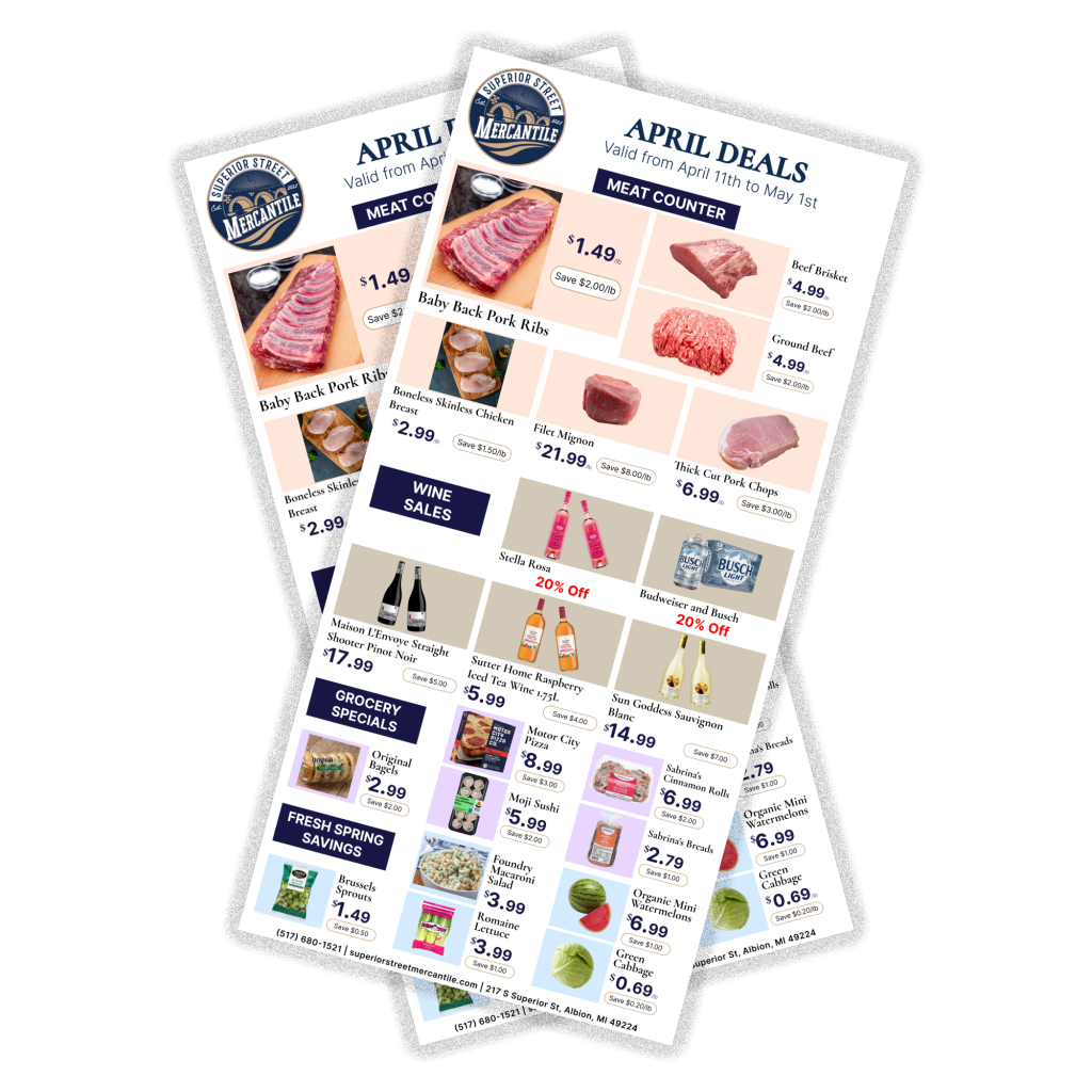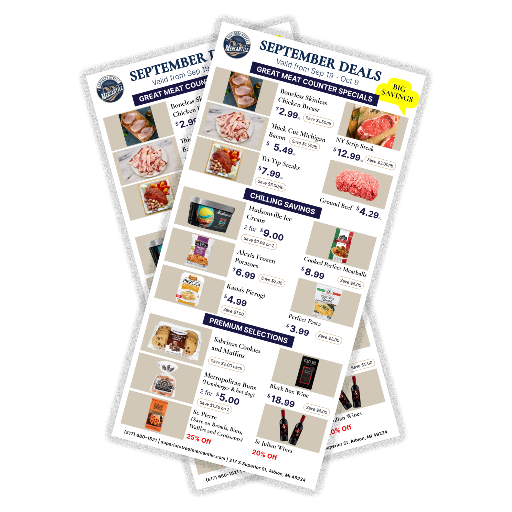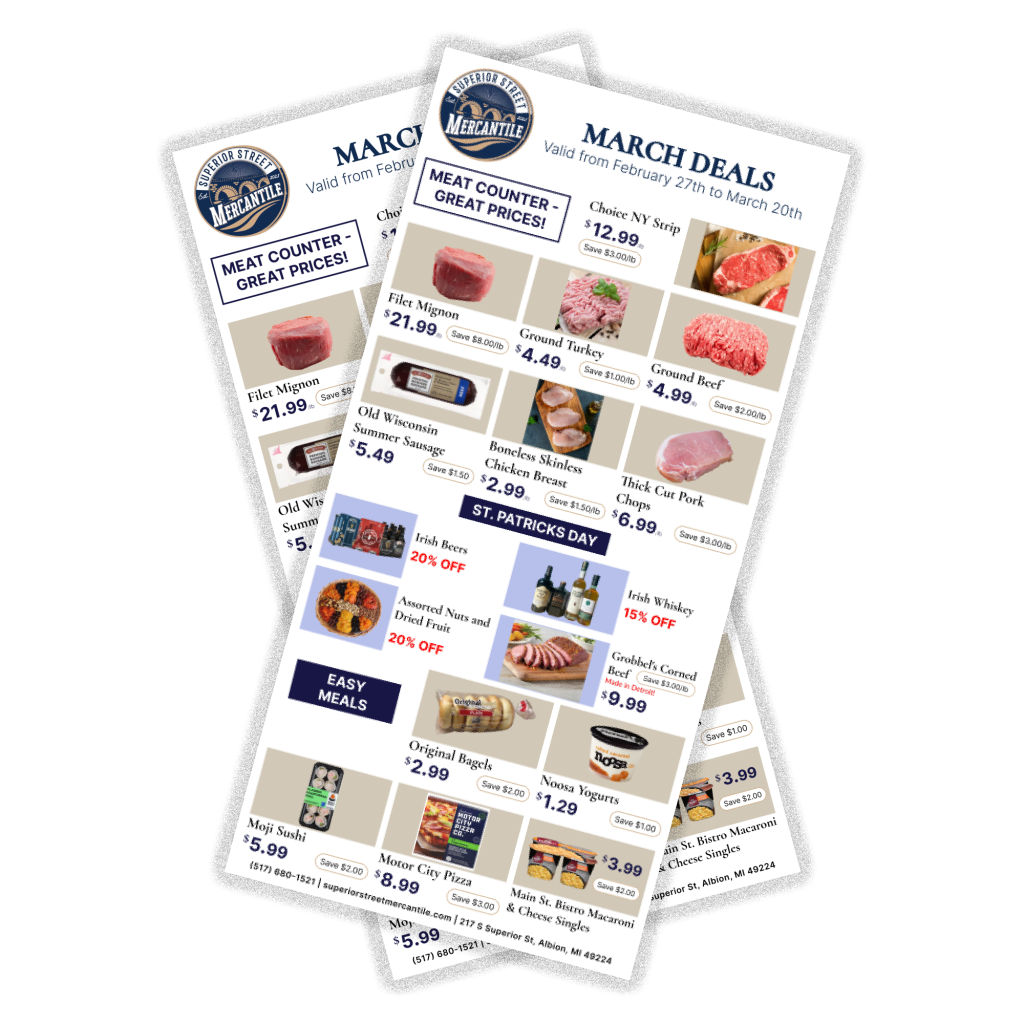 At Superior Street Mercantile, we’re more than a grocery store—we’re a hub for exceptional products and local flavor. From farm-fresh produce and quality dairy to gourmet specialties and everyday essentials, we carefully curate every item for its taste, quality, and connection to Michigan’s finest offerings.