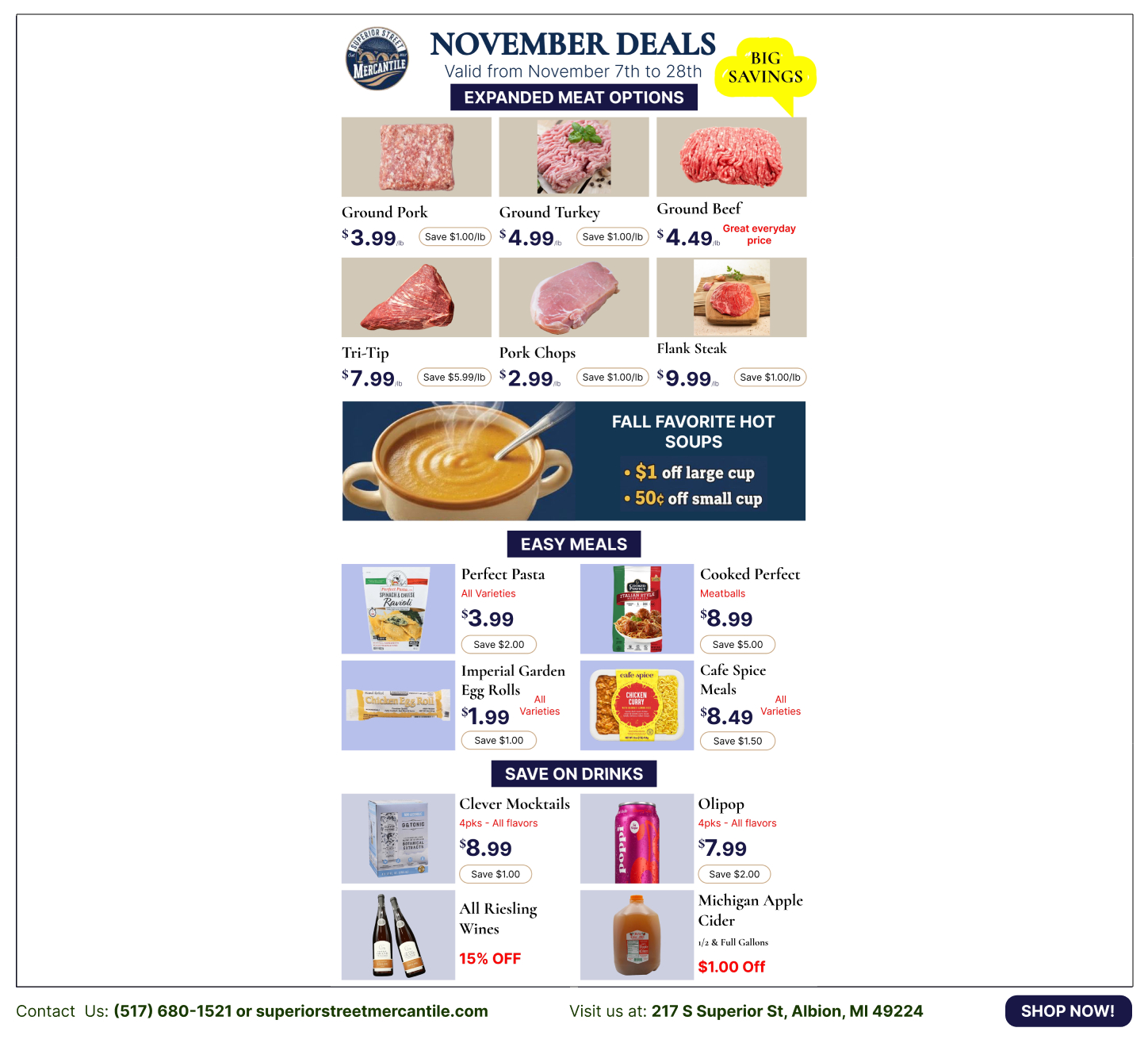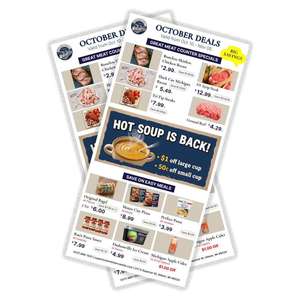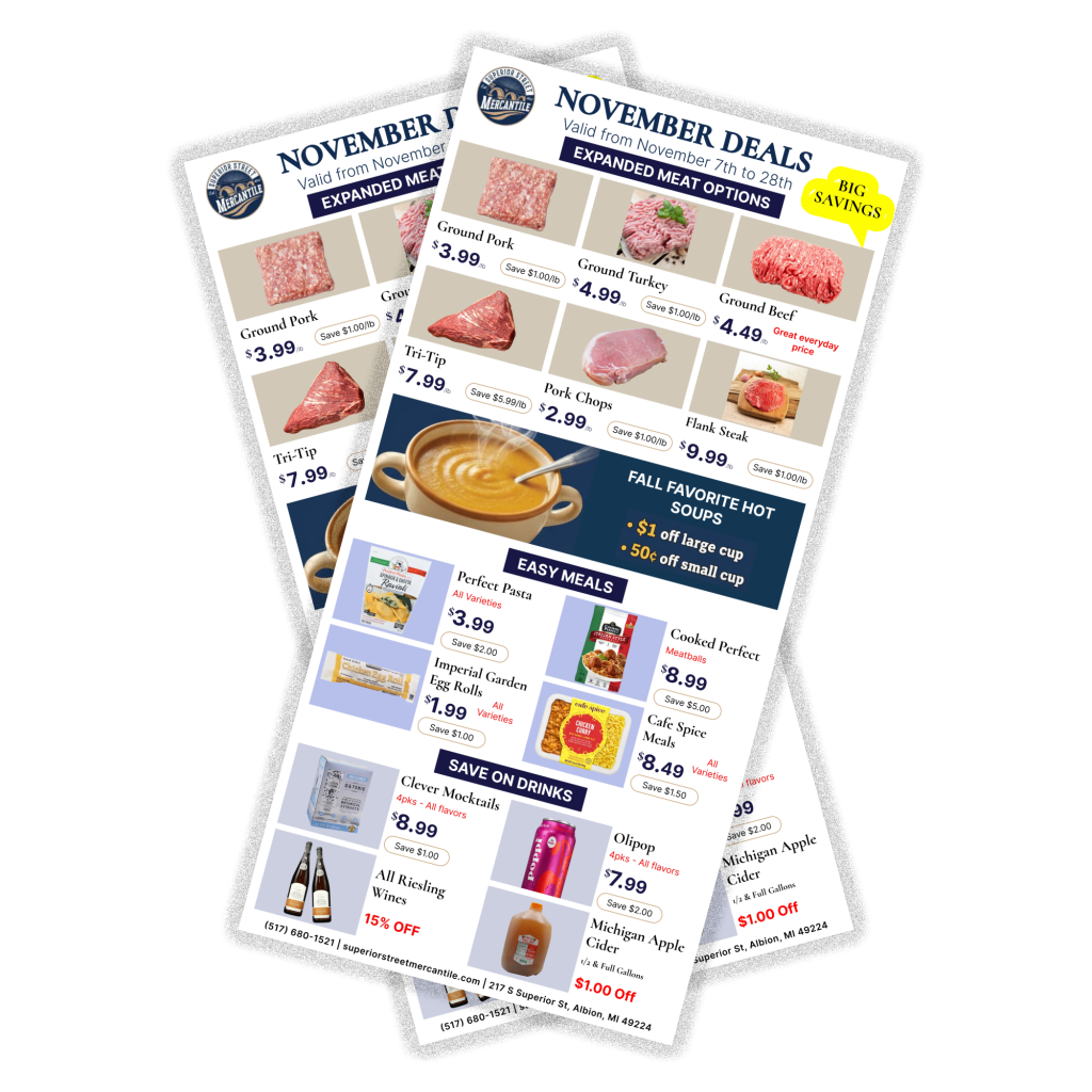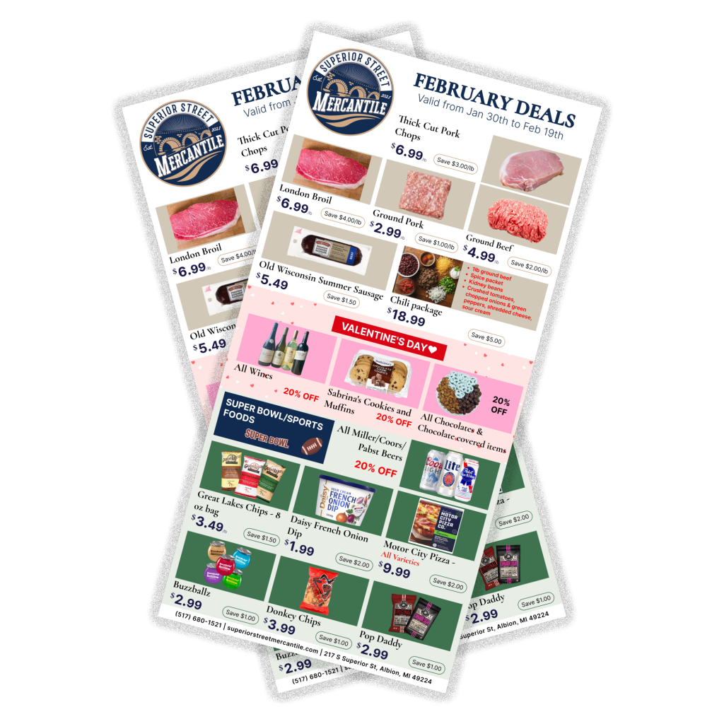 Welcome to Superior Street Mercantile, your local downtown market where modern freshness meets timeless tradition. Since our founding in December 2021, we have been proud to be part of the effort to reinvigorate Downtown Albion, building our community one storefront at a time.