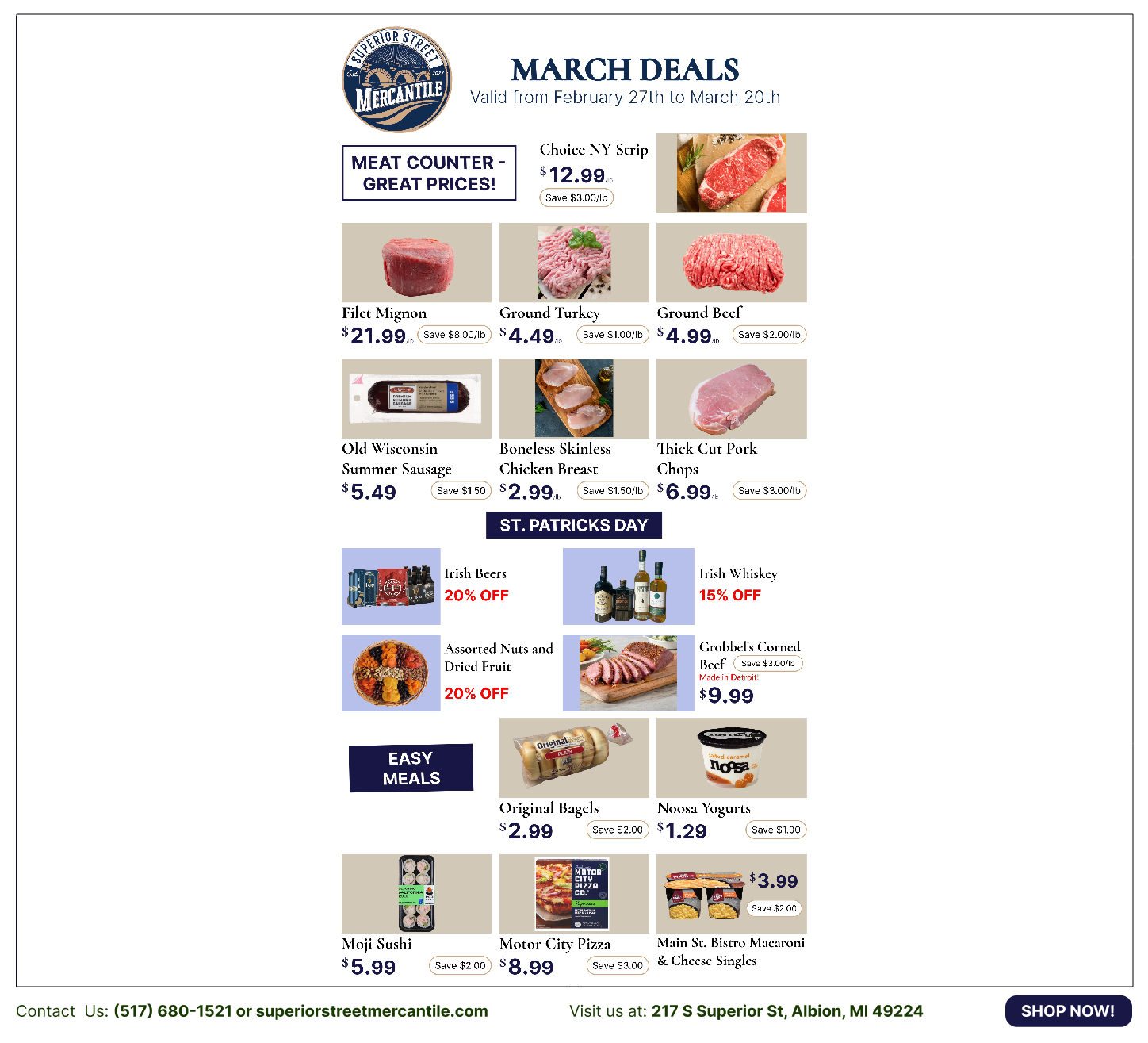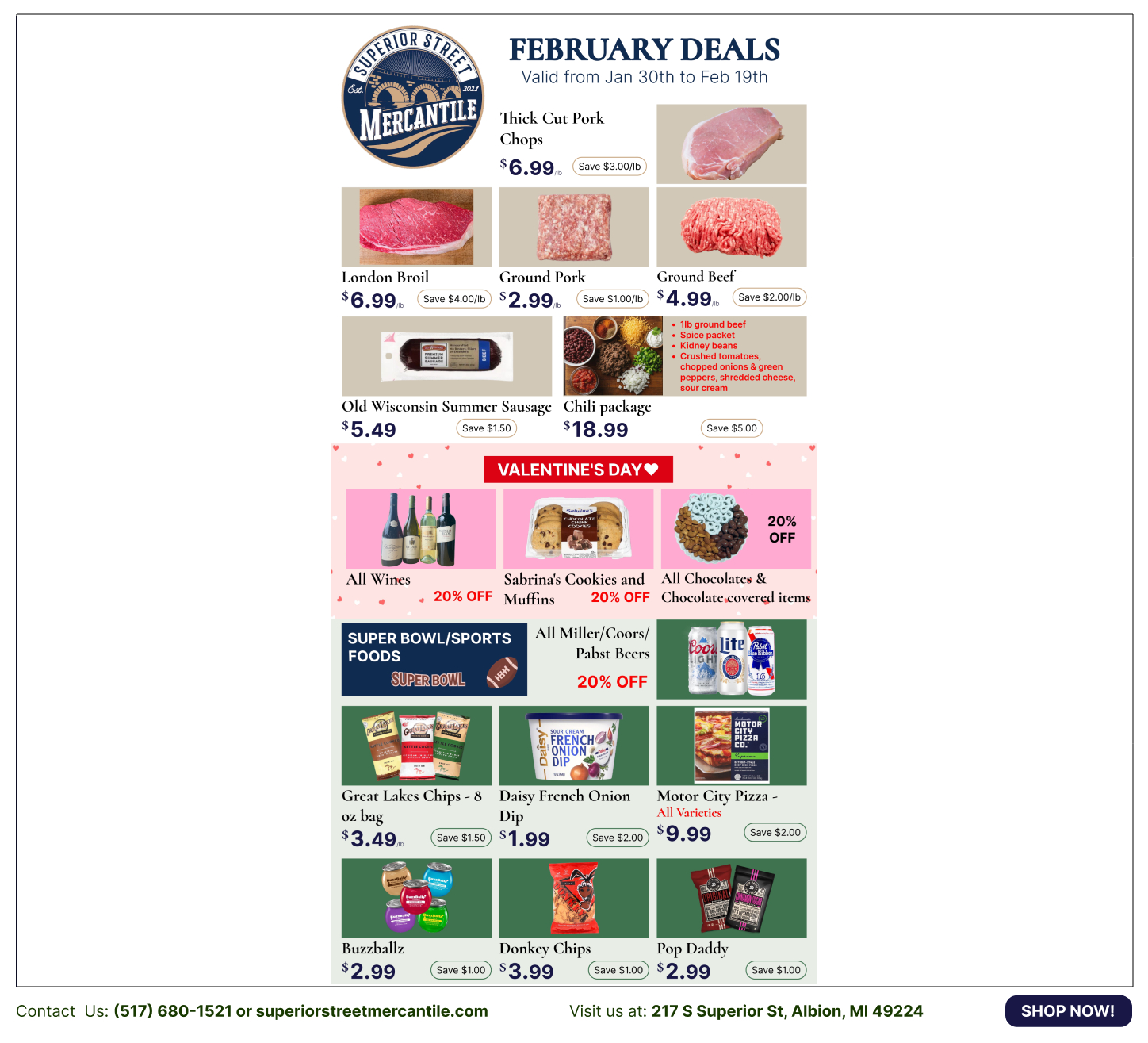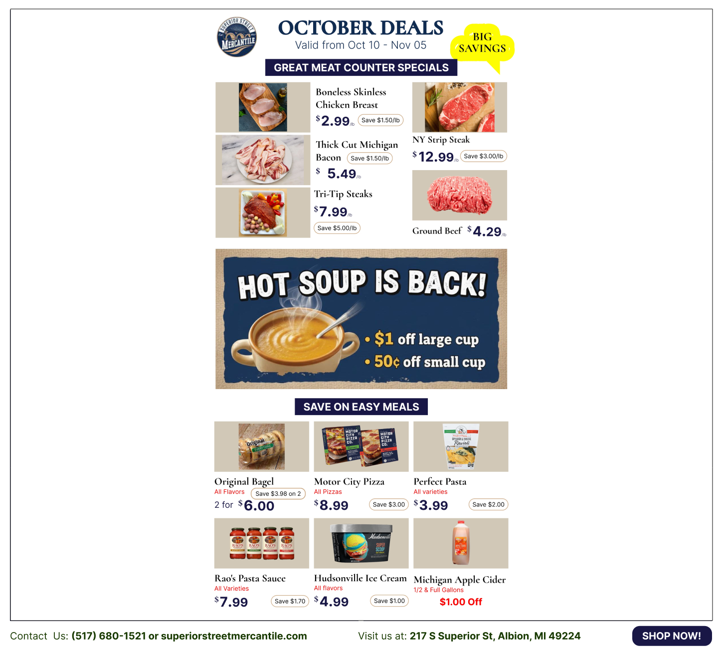 Welcome to Superior Street Mercantile, your local downtown market where modern freshness meets timeless tradition. Since our founding in December 2021, we have been proud to be part of the effort to reinvigorate Downtown Albion, building our community one storefront at a time.