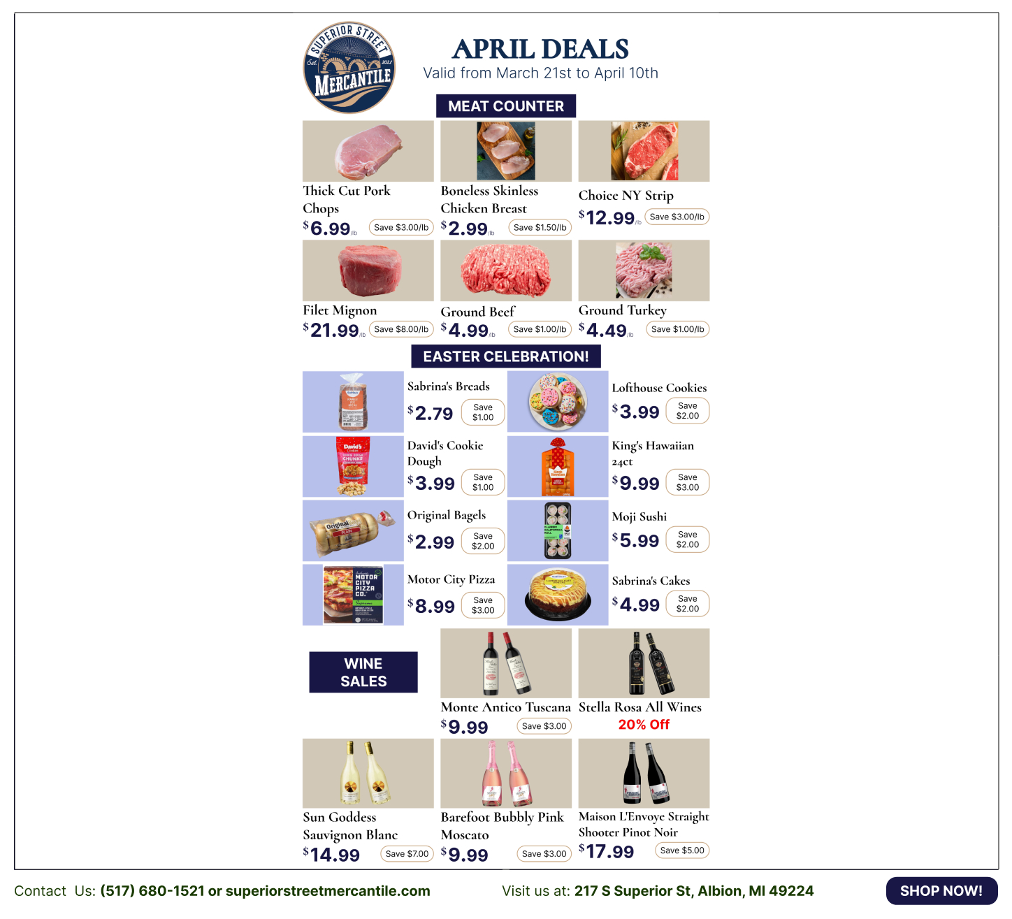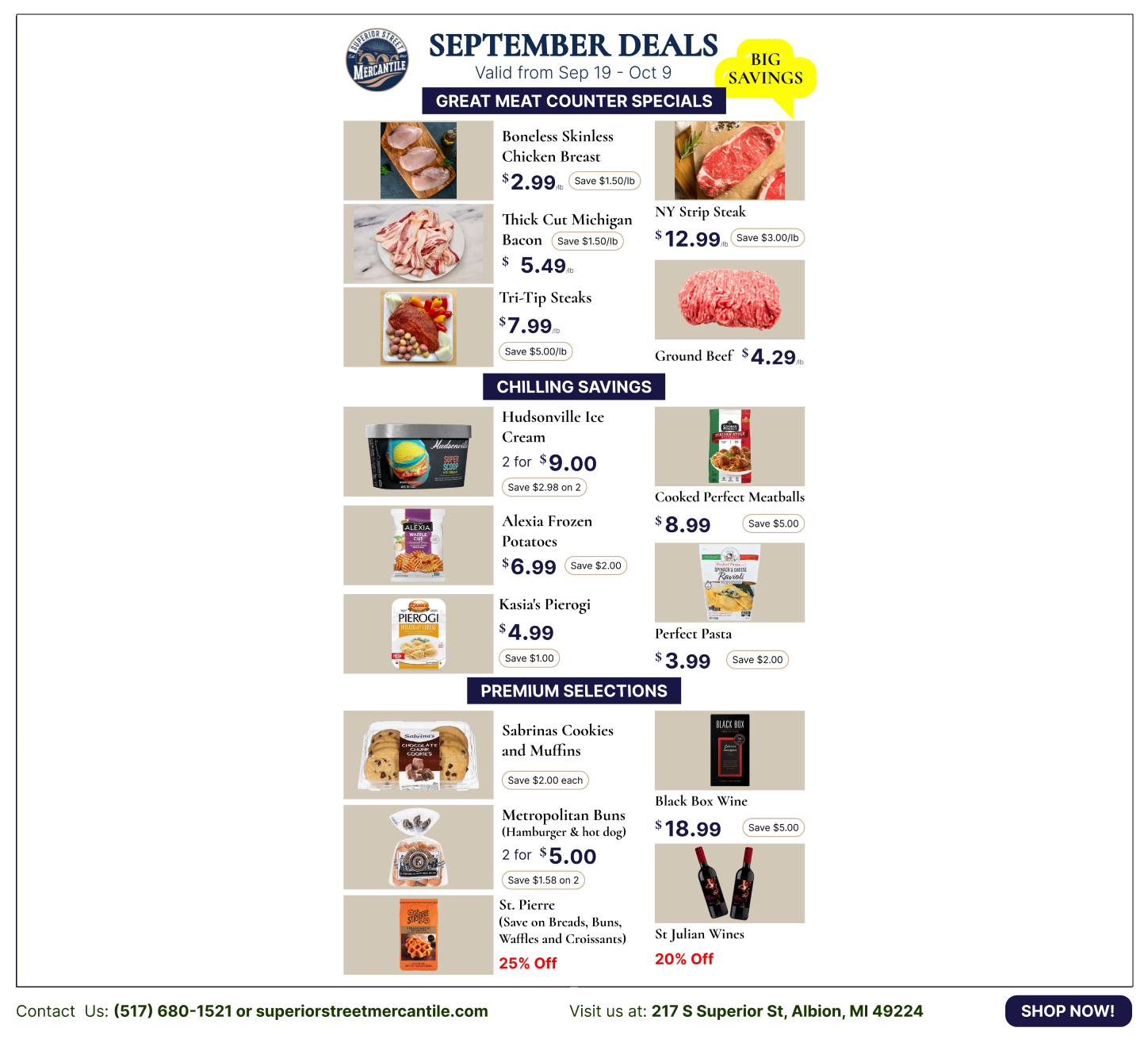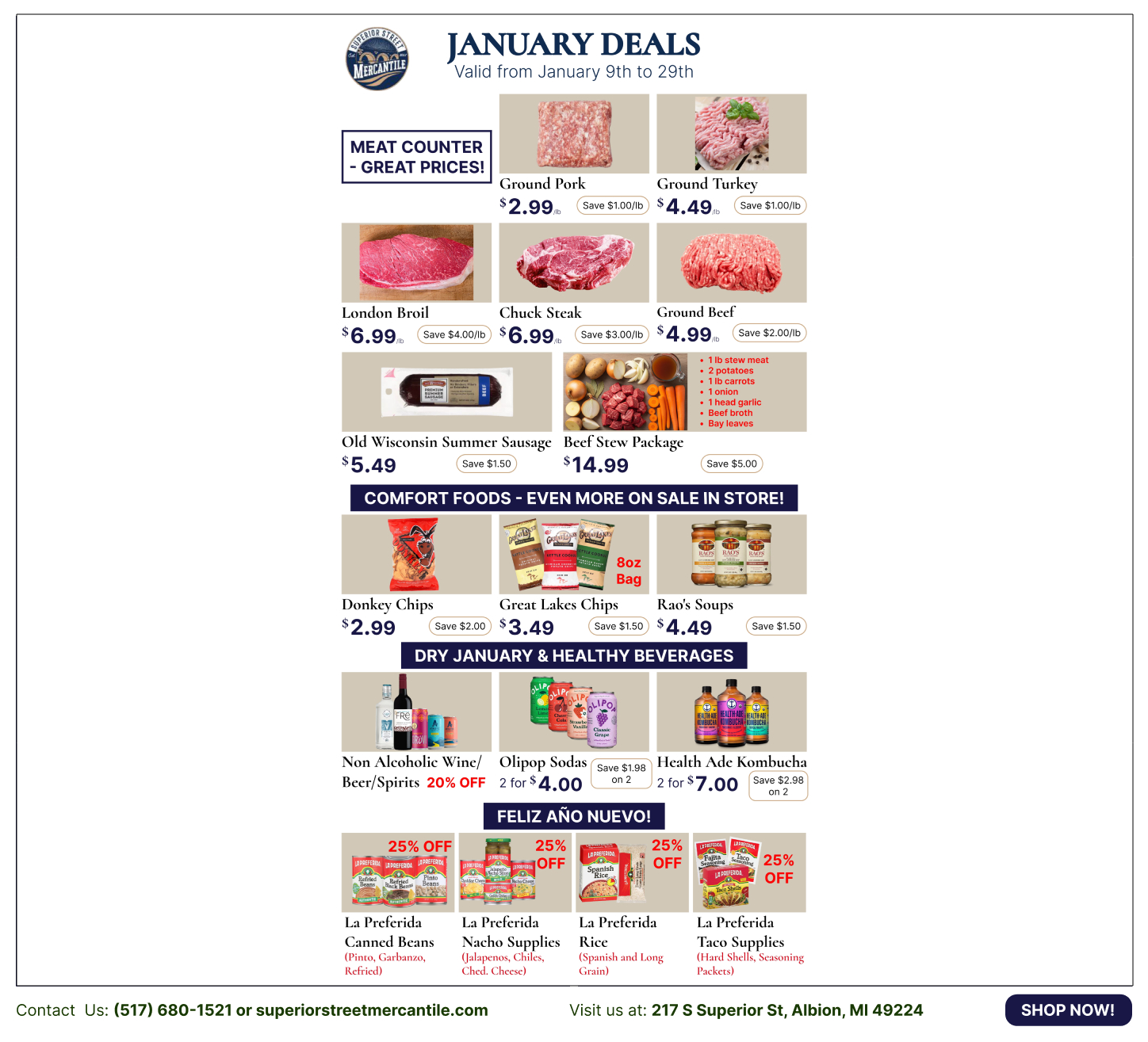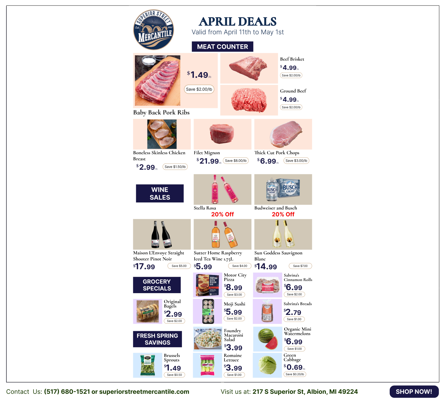 Welcome to Superior Street Mercantile, your local downtown market where modern freshness meets timeless tradition. Since our founding in December 2021, we have been proud to be part of the effort to reinvigorate Downtown Albion, building our community one storefront at a time.